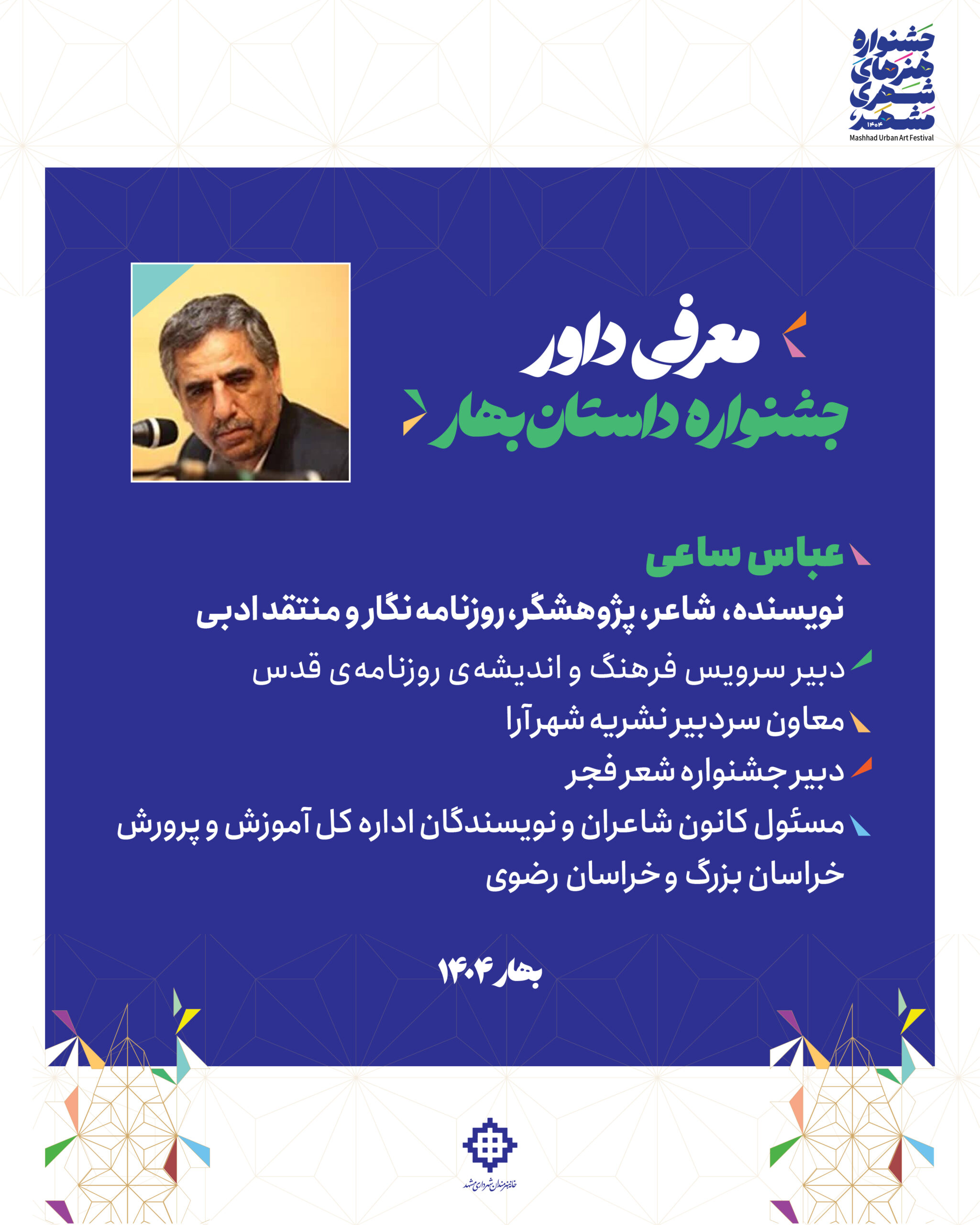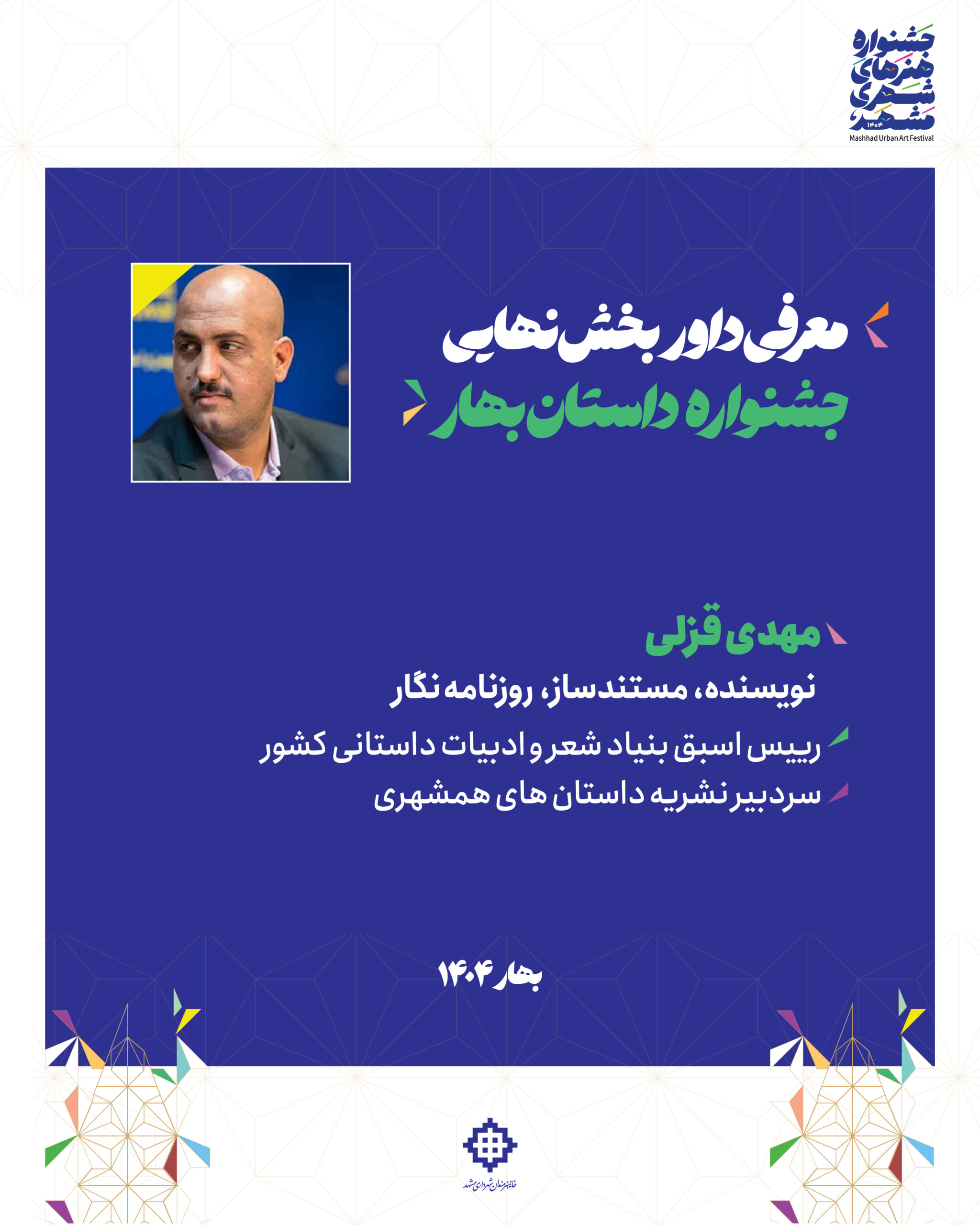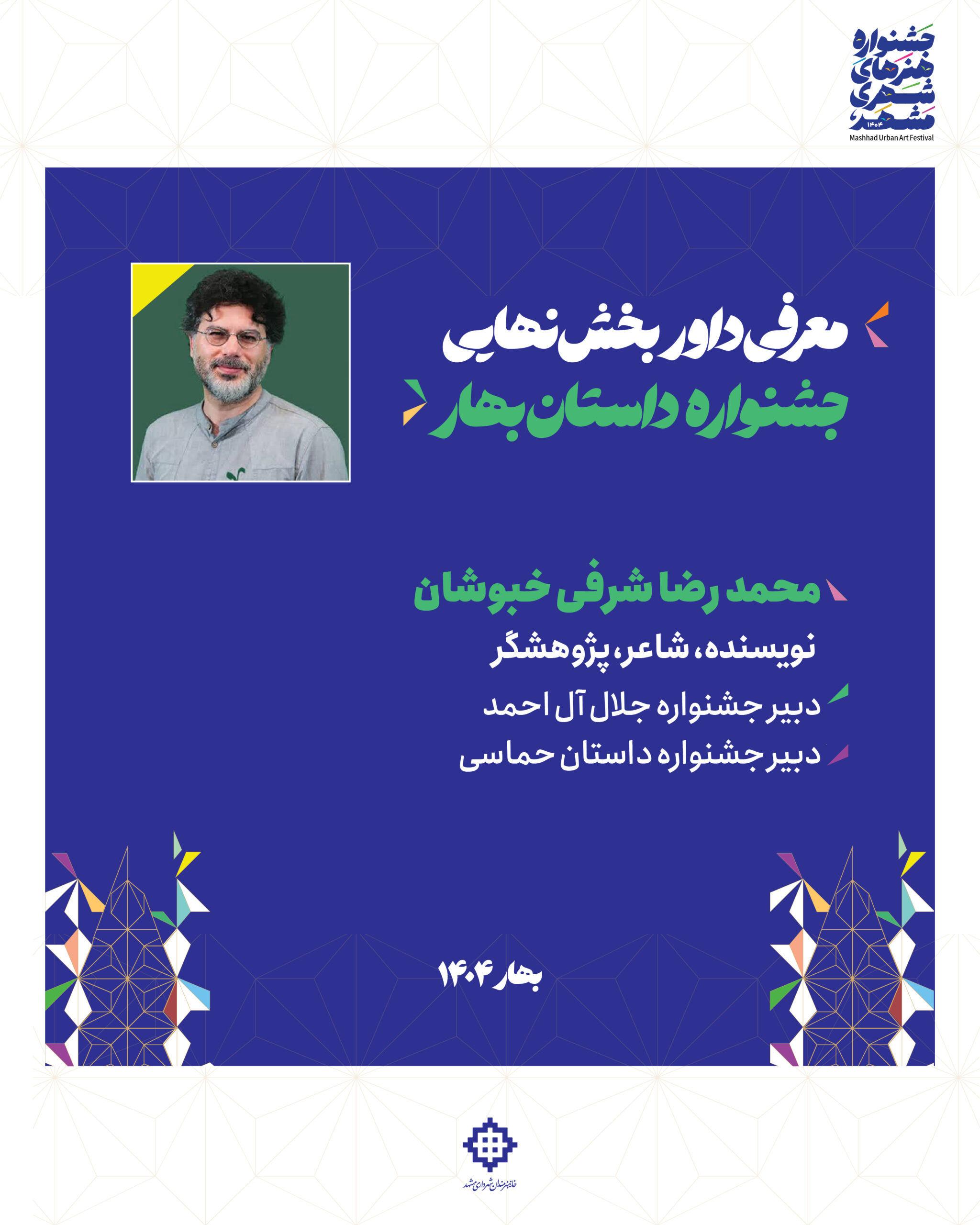 🔹دبیر جشنواره داستان بهار با اشاره به تنوع و کیفیت آثار ارسالی، اظهار داشت: در بخشهای مختلف، با رمانهای قوی و داستانهای کوتاه جذاب روبرو بودیم که اغلب در حیطه بومی و شهری نگارش شده بودند. این تنوع موضوعی و پرداخت حرفهای، نشان از پویایی و ظرفیت بالای ادبیات داستانی در مشهد وکشور دارد.