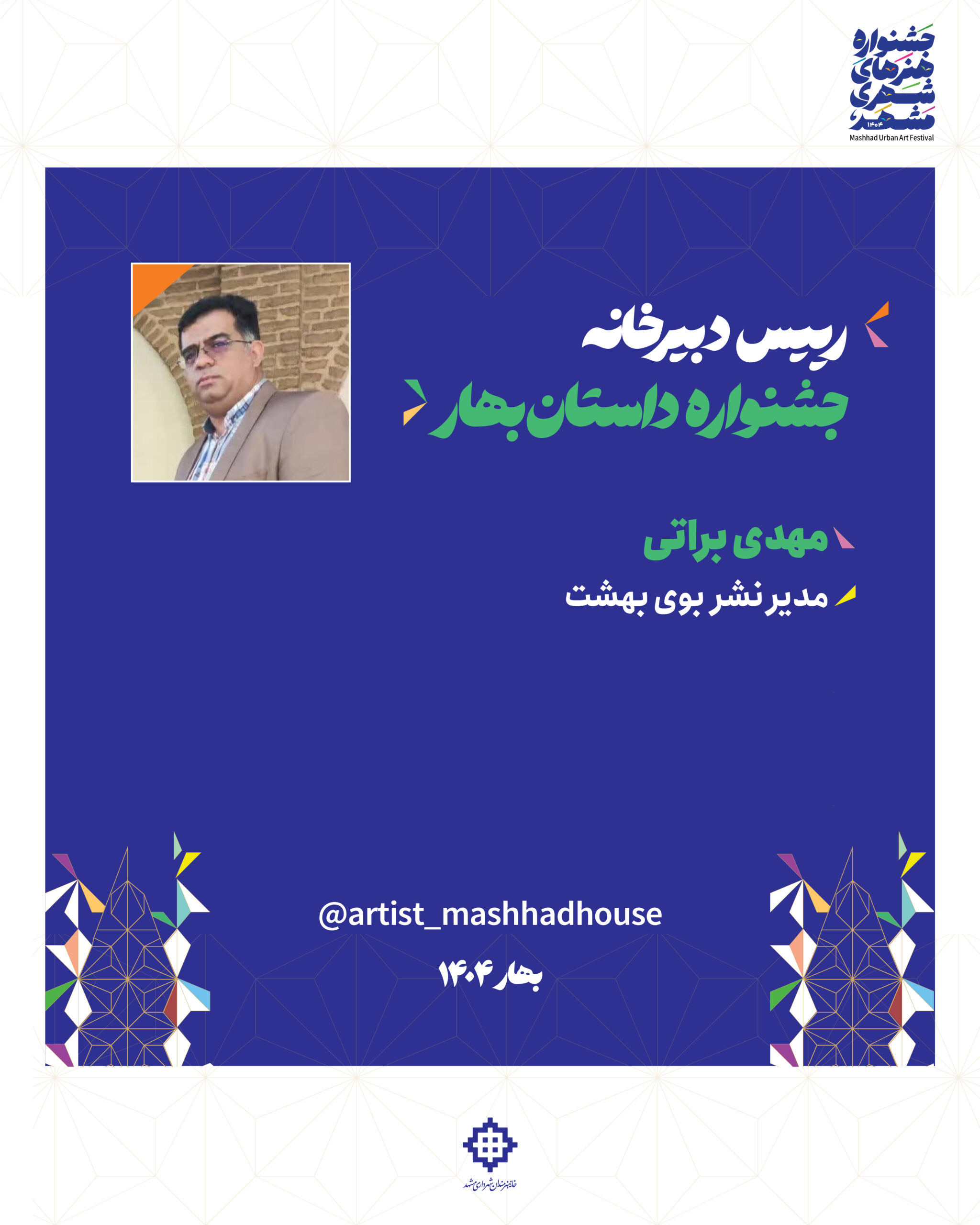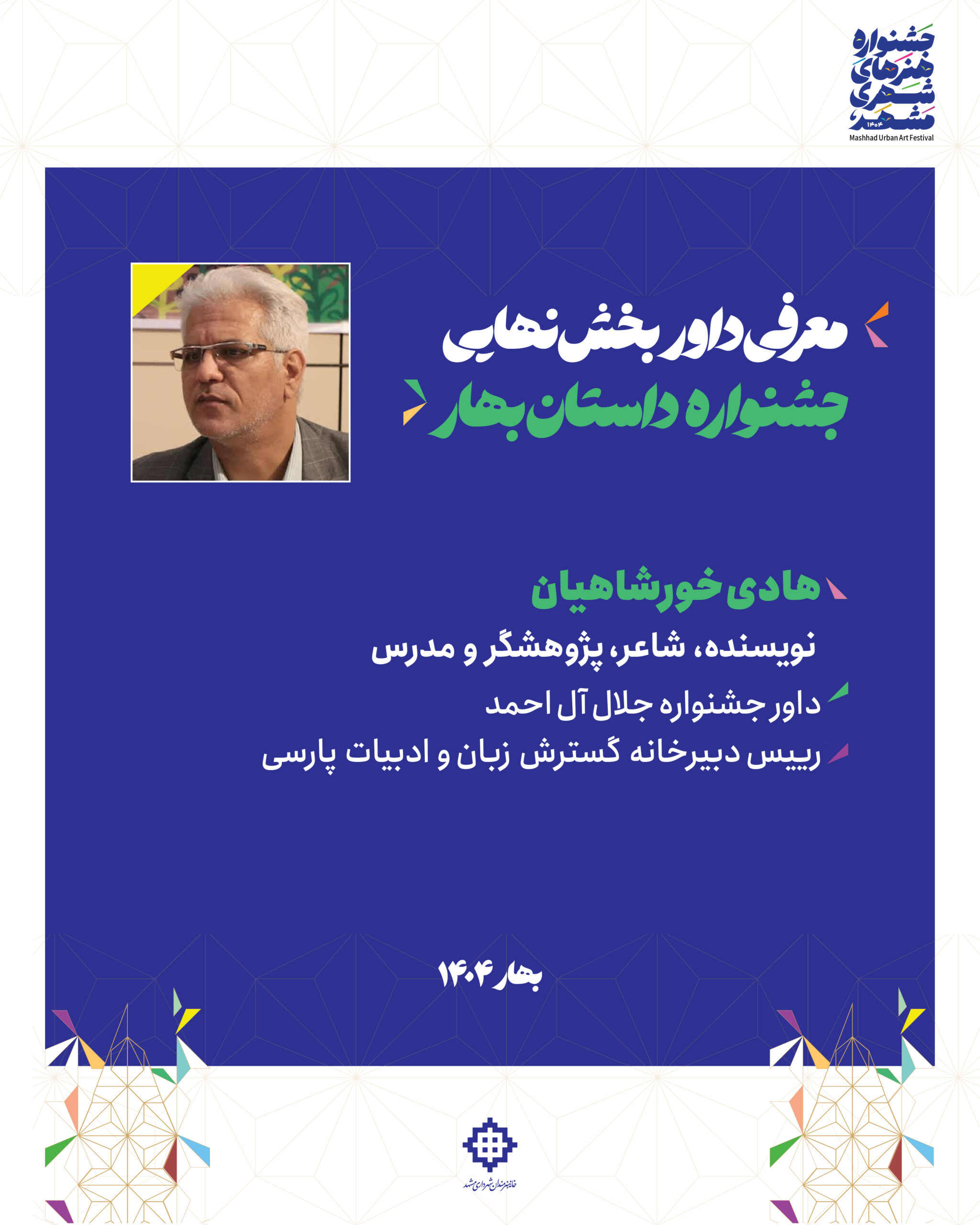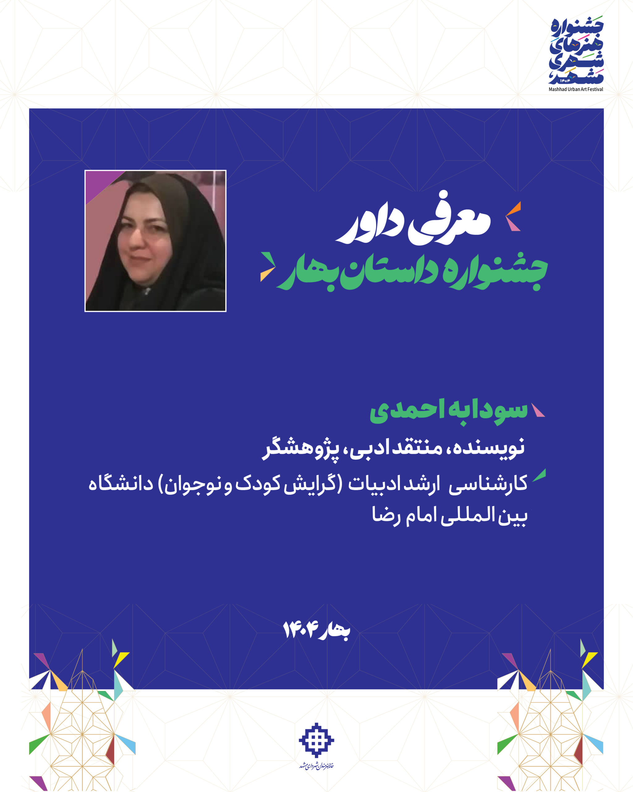 🔹براتی گجوان در پایان ابراز امیدواری کرد که جشنواره داستان بهار ۱۴۰۴، بتواند گامی موثر در جهت کشف و معرفی استعدادهای درخشان ادبیات داستانی در مشهد و کشور باشد.